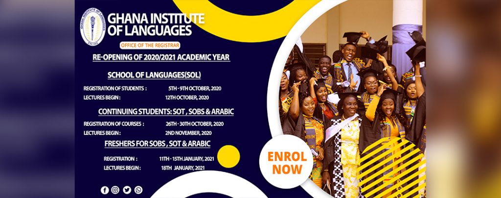 Re-Open Arrangements for the 2021/2022 Academic year Post published:April 25, 2021 Post category:LATEST NEWS The Ghana Institute of Languages through the office of the registrar has issued a notice on re-opening arrangements for the 2021/2022 academic year. The Notice had the breakdown arrangements for SOL, SOBS and SOT. See below for details; You Might Also Like GIL opens admissions for undergraduate/postgraduate programmes April 25, 2021 GIL Launches Admission E-Voucher Services April 25, 2021 GIL institutes a Call Centre for Admission Enquiries April 24, 2021